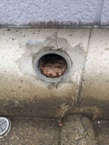 トイレの排水が詰まったとの事で高圧洗浄したときの写真ですが、ここは掃除口です。ここまでトイレットペーパーが来ててこの奥の竪管のあたりで100Φの排水管にパンパンに詰まっていました。