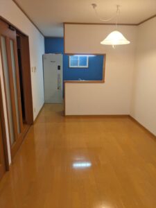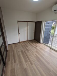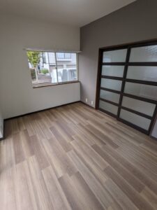 これは今やってる原状回復工事ですね。床張りとクロス張りです。今日、電気屋さんがエアコンつけてくれるらしいので完了になると思います。