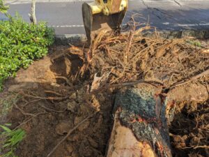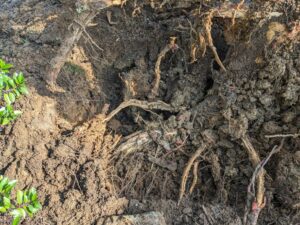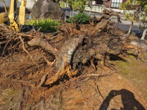 もう見てこれ、写真だと全然わかんないけどちょっとした木の幹レベルの根が4本かな?ほんと四方に走ってて、そこからさらに親指くらいの太さの枝根が走っててそこからさらに毛細血管みたいな根がメッシュ状に張り巡らされていました。